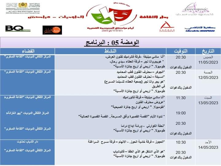 أعلنت فرقة “فانوراميك لفنون العرض بمراكش” عن برنامج أيام مراكش للمسرحية القصيرة الممتدة ما بين 11 و 14 من ماي الجاري بدار الثقافة الداوديات مراكش ودار الشباب بمدينة تاحناوت، والتي تاتي في إطار الاحتفال باليوم الوطني للمسرح، بتكريم القصة القصيرة العمانية.