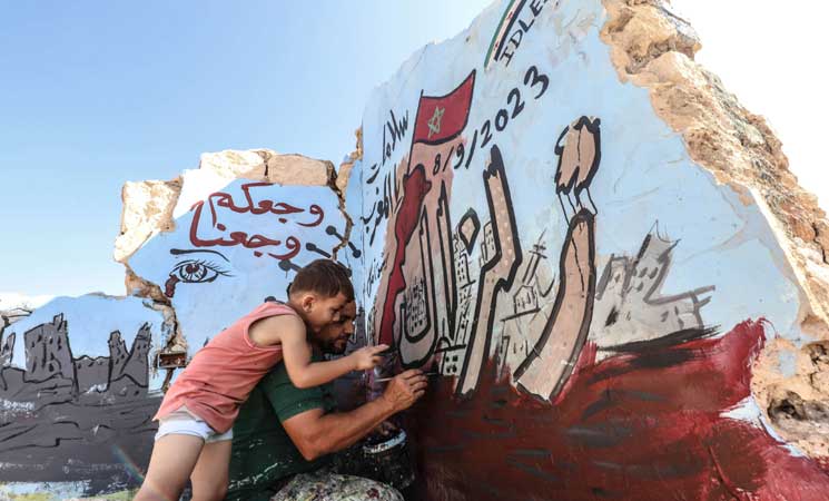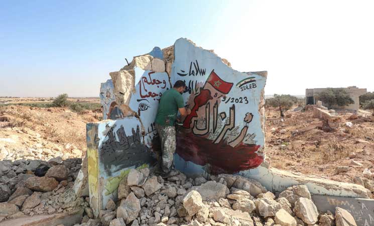 تضامن فريد من نوعه، أقدم عليه الرسّام الغرافيتي السوري عزيز أسمر، معبرا عن تضامنه مع منكوبي زلزال المغرب عن طريق إبداع الرسم على جدران مبنى مهدّم في منطقة إدلب، شمال غربي سوريا.