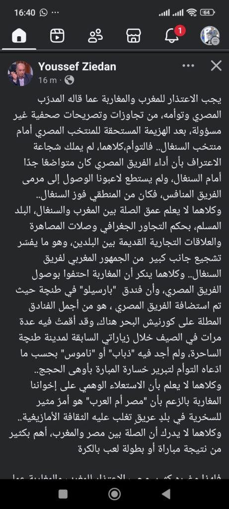 وختم زيدان تدوينته بالتأكيد على ضرورة تقديم اعتذار للمغرب والمغاربة عن هذه التجاوزات، مؤكدًا في الوقت نفسه أن عموم المصريين يقدّرون ويحترمون المغرب وشعبه، ويعترفون بالود والمحبة التي تربط البلدين على مدى ألف سنة من التاريخ المشترك.