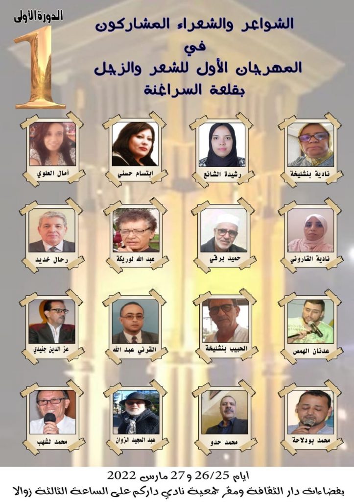 أعلن الأستاذ المبدع محمد لشهب، عن البرنامج العام لفعاليات المهرجان الأول للشعر والزجل تحت شعار : “أرض تساوت قلعة الشعر والزجل”دورة المبدع المرحوم ابراهيم كلالي أيام 27/26/25 مارس 2022، وذلك بمقر دار الثقافة وجمعية نادي داركم بقلعة السراغنة.