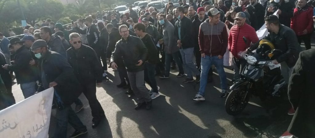وتدفقت أعداد غفيرة بعد انطلاق المسيرة، رافعين شعارات نارية، تدعو إلى إسقاط قرار الحكومة بإغلاق الأجواء الوطنية، مرددين عبرات مثل “الشعب يريد فتح الحدود” و”باراكا باراكا من هذ العياقة”و “هز قدم شد كدم السياحة باتخدم” .. إلخ، مناشدين التمثيليات النقابية بفعل ما يجب لإيقاف نزيف الأزمة التي أكلت الأخضر واليابس، كما يرددون؟